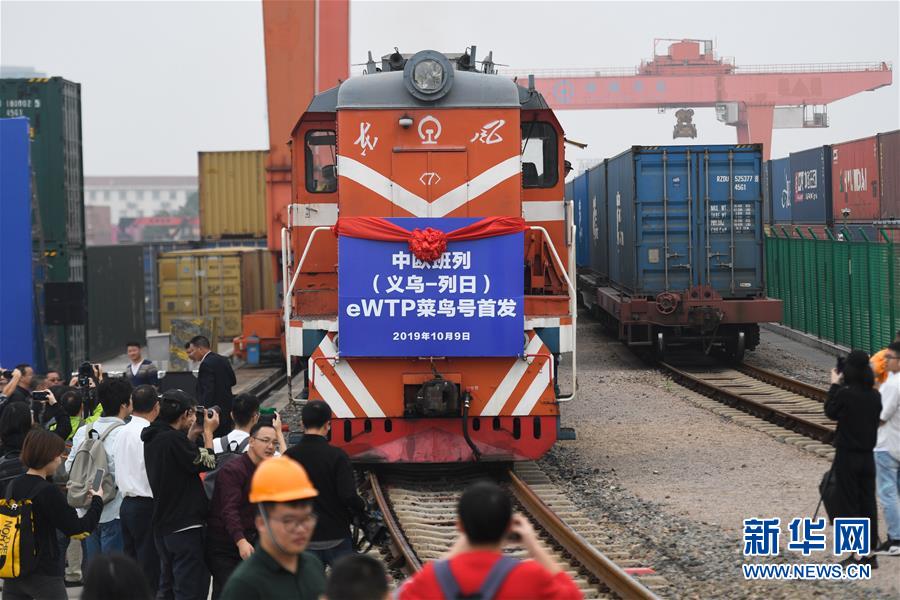 10月9日,中欧班列(义乌-列日)eWTP菜鸟号准备从浙江义乌火车西站开出。 当日,中欧班列(义乌-列日)eWTP菜鸟号正式开通,这趟国际货运班列满载着82个标准箱从义乌西货运站鸣笛启程,预计20天左右抵达比利时列日。 随着中欧班列(义乌-列日)运营方向的开通,义乌始发的中欧班列已达到11条线路,辐射欧亚大陆37个国家和地区,实现丝路沿线主要贸易国家与地区的全覆盖。 新华社记者 黄宗治 摄