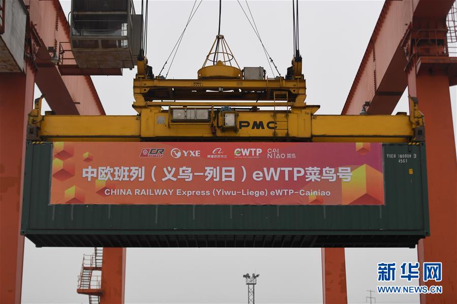 10月9日,在浙江义乌火车西站,中欧班列(义乌-列日)eWTP菜鸟号的一节集装箱被吊装入列。 当日,中欧班列(义乌-列日)eWTP菜鸟号正式开通,这趟国际货运班列满载着82个标准箱从义乌西货运站鸣笛启程,预计20天左右抵达比利时列日。 随着中欧班列(义乌-列日)运营方向的开通,义乌始发的中欧班列已达到11条线路,辐射欧亚大陆37个国家和地区,实现丝路沿线主要贸易国家与地区的全覆盖。 新华社记者 黄宗治 摄