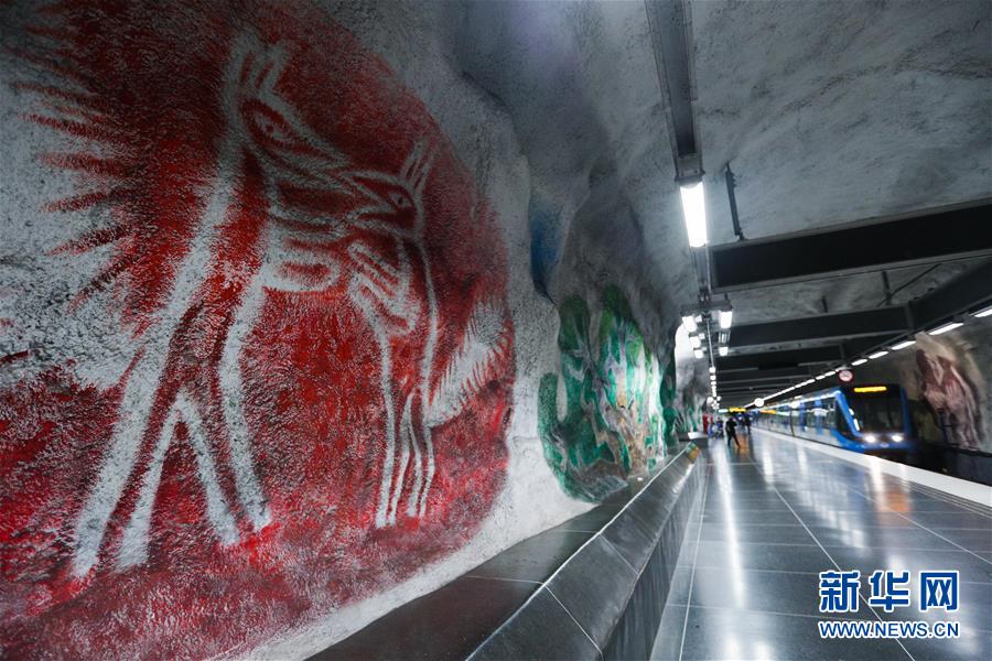 10月8日,在瑞典斯德哥尔摩,一列地铁抵达一处地铁站。 在瑞典首都斯德哥尔摩,每座地铁站的站台、墙壁及大厅的风格设计都无一相同,各有特色。艺术家们运用了各类艺术元素装点地铁站,色彩缤纷的视觉效果既突出了每个站台的个性,也丰富了乘客的旅途体验。走进斯德哥尔摩地铁,仿佛置身于一座“地下艺术长廊”。 新华社记者郑焕松摄