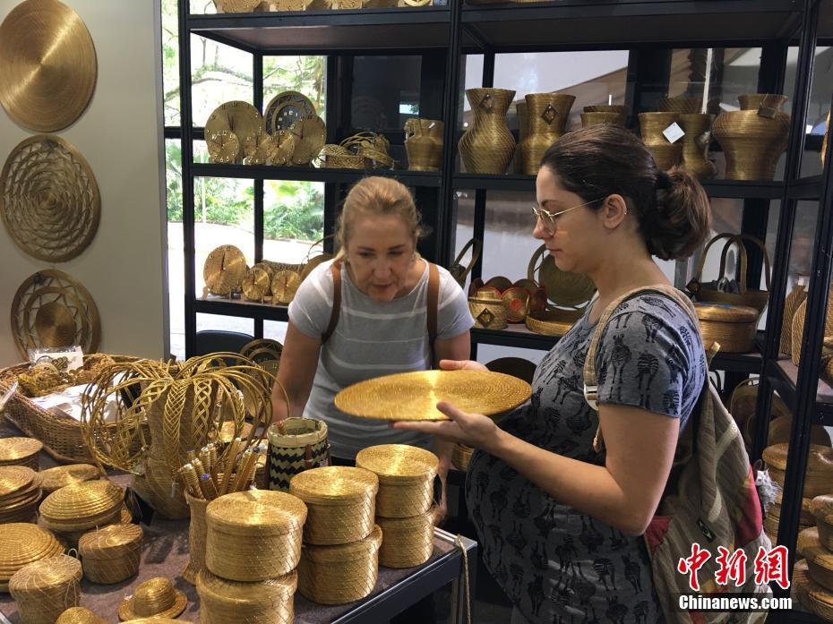 当地时间10月10日,为期5天的第13届巴西手工艺品展在圣保罗伊比拉普埃拉公园的比依纳尔展馆举行,富有巴西各州特色的手工艺品吸引了众多参观者和采购商。有不少巴西民间艺术家现场制作工艺品,令人大开眼界。图为顾客参观巴西黄金草制品。中新社记者 莫成雄 摄