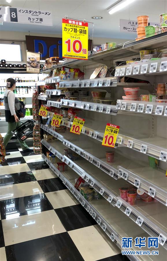 10月11日,在日本东京一家超市,部分食品类商品被抢购一空(手机拍摄)。 据日本气象部门预测,今年第19号台风“海贝思”将于11日至13日接近并登陆日本。 新华社记者马曹冉摄