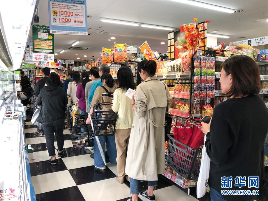 10月11日,在日本东京一家超市,抢购商品的人们排队结账(手机拍摄)。 据日本气象部门预测,今年第19号台风“海贝思”将于11日至13日接近并登陆日本。 新华社记者马曹冉摄