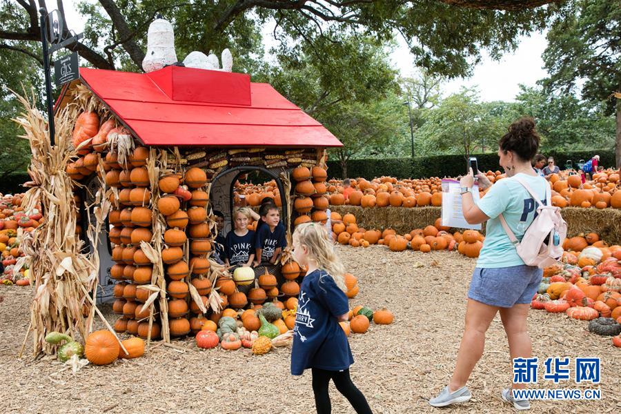 10月10日,在美国得克萨斯州达拉斯植物园的“南瓜小镇”,一名女子为孩子们拍照。 美国得克萨斯州达拉斯市植物园每年秋天都要搭建一座“南瓜小镇”,今年的“南瓜小镇”以美国著名漫画人物查理·布朗和他的小伙伴们为主题。 新华社发(田丹摄)