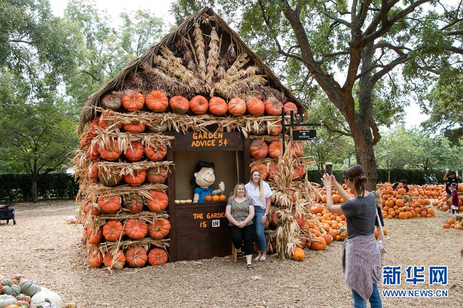 10月10日,在美国得克萨斯州达拉斯植物园的“南瓜小镇”,游客们在南瓜小屋前留影。 美国得克萨斯州达拉斯市植物园每年秋天都要搭建一座“南瓜小镇”,今年的“南瓜小镇”以美国著名漫画人物查理·布朗和他的小伙伴们为主题。 新华社发(田丹摄)