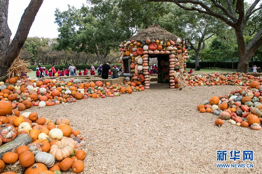 这是10月10日在美国得克萨斯州拍摄的达拉斯植物园的“南瓜小镇”。 美国得克萨斯州达拉斯市植物园每年秋天都要搭建一座“南瓜小镇”,今年的“南瓜小镇”以美国著名漫画人物查理·布朗和他的小伙伴们为主题。 新华社发(田丹摄)