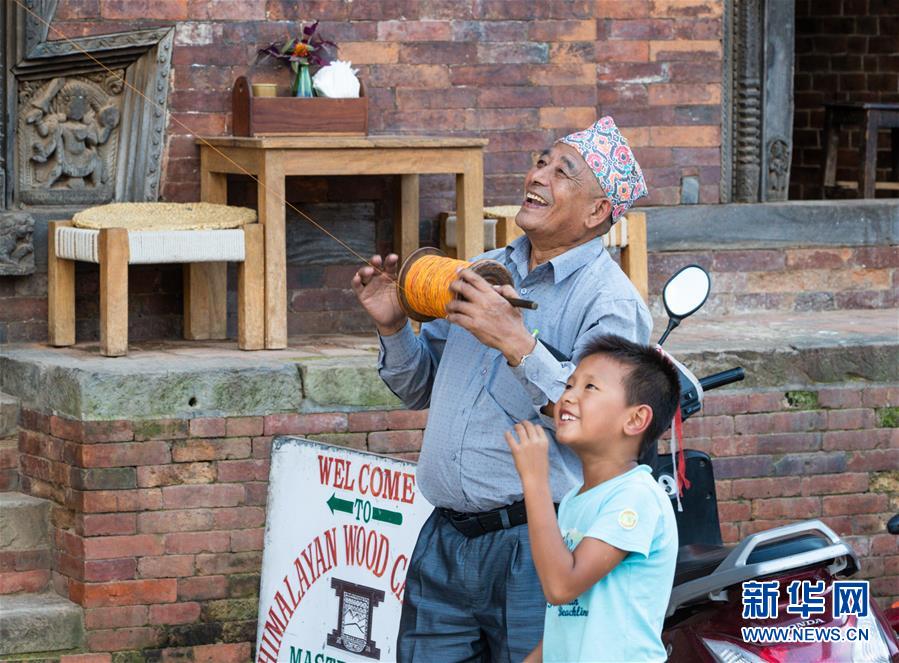 2019年10月9日,一位老人和一名男孩在尼泊尔巴德岗放风筝。 尼泊尔位于喜马拉雅山南麓,与中国和印度相邻,是一个内陆山国。 新华社记者 张可任 摄