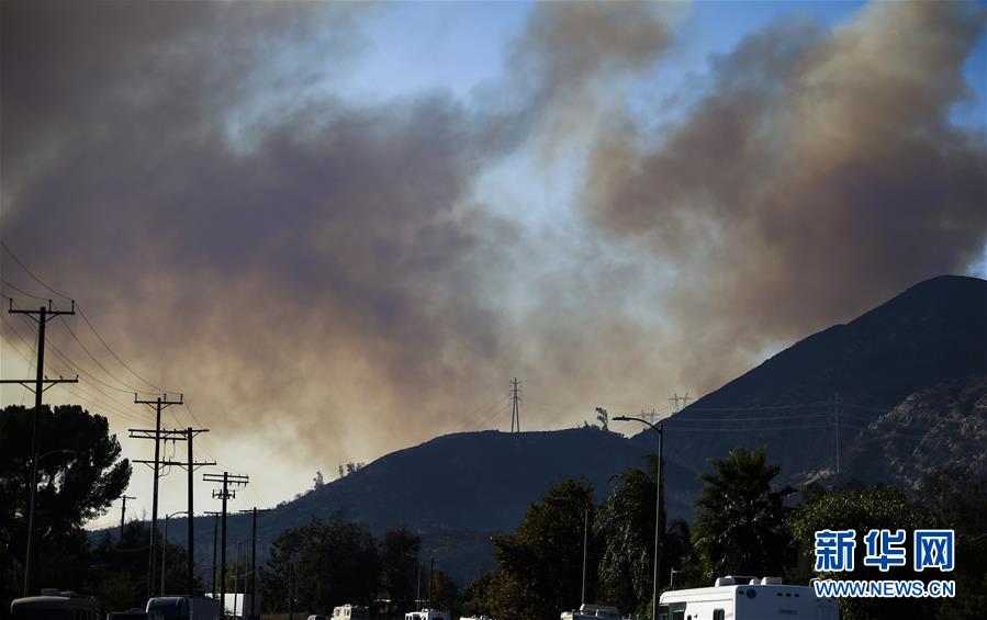 10月11日,在美国洛杉矶西北的西尔马,发生山火的地点冒出浓烟。新华社记者李颖摄