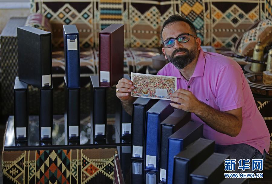 10月12日,黎巴嫩男子维萨姆·阿里·优素福在位于黎巴嫩南部舍格拉地区的家中展示其收藏的纸币。新华社发(比拉尔·贾维希摄)