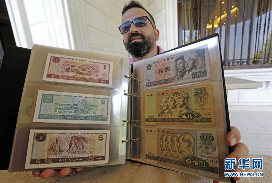 10月12日,黎巴嫩男子维萨姆·阿里·优素福在位于黎巴嫩南部舍格拉地区的家中展示其收藏的人民币。 新华社发(比拉尔·贾维希摄)