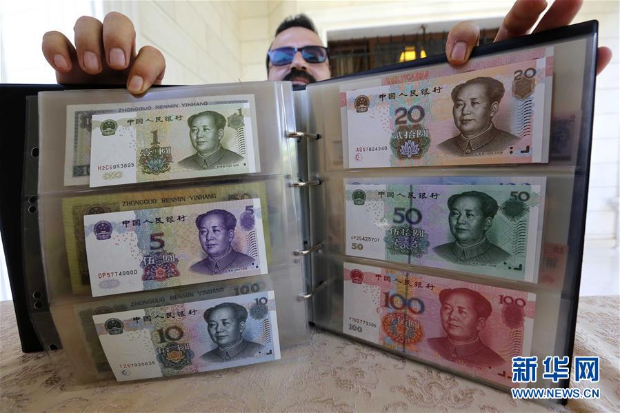 10月12日,黎巴嫩男子维萨姆·阿里·优素福在位于黎巴嫩南部舍格拉地区的家中展示其收藏的人民币。 新华社发(比拉尔·贾维希摄)