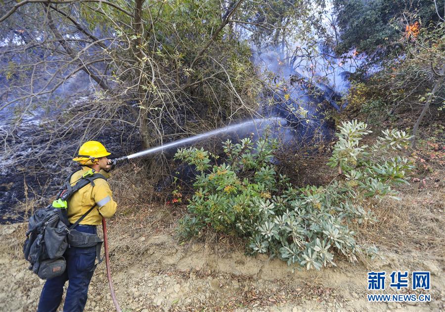 当日,消防人员持续应对加州山火。洛杉矶消防局12日称,10日晚爆发的山火过火面积已达7552英亩(约合30.6平方公里),19%的火势得到控制。 新华社发(钱卫忠摄)