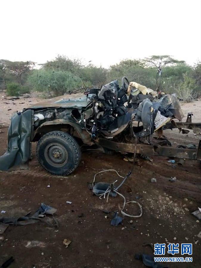 这是10月12日在肯尼亚加里萨郡拍摄的炸弹袭击后的汽车。 肯尼亚东北部靠近索马里的加里萨郡12日发生一起路边炸弹袭击事件,造成至少10名警察死亡。 新华社发
