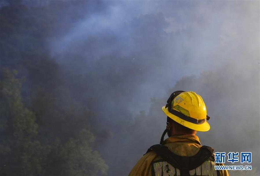 10月12日,在美国加利福尼亚州西尔马,消防员在山火现场执勤。新华社记者 李颖 摄