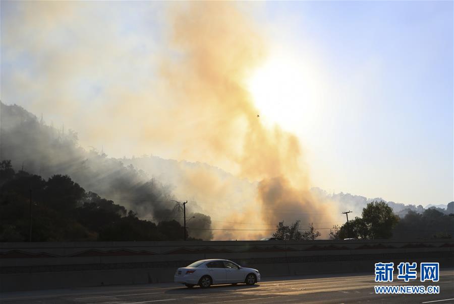 10月12日,在美国加利福尼亚州西尔马,山火燃烧冒出浓烟。新华社记者 李颖 摄