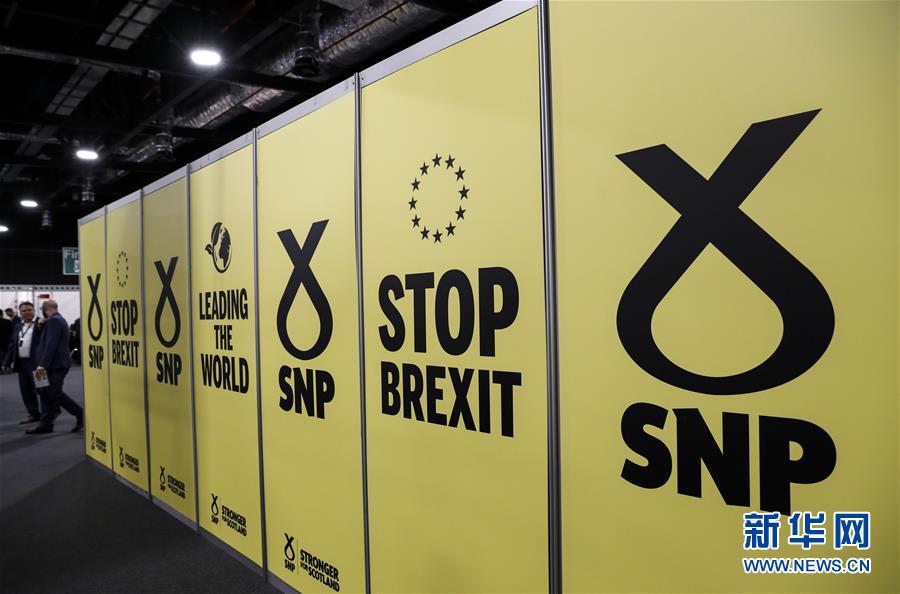 这是10月14日在英国苏格兰阿伯丁拍摄的苏格兰民族党年会展厅内的标语。 2019年苏格兰民族党年度大会于10月13日至15日在英国苏格兰北部城市阿伯丁举行。 新华社记者 韩岩 摄