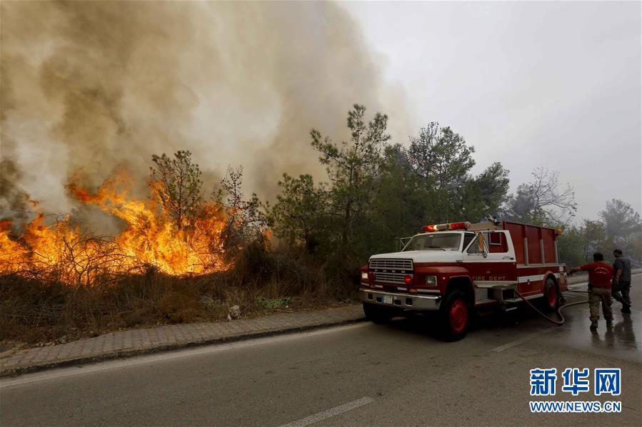 10月15日,在黎巴嫩首都贝鲁特东南的舒夫山区,一辆消防车执行灭火工作。 据当地媒体报道,舒夫山区14日突发山林大火。黎巴嫩属地中海气候,每年夏秋时节为旱季,时常会发生山林火灾。 新华社发(比拉尔·贾维希摄)