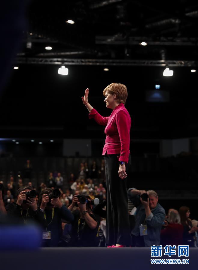 10月15日,在英国苏格兰北部城市阿伯丁,苏格兰政府首席大臣、苏格兰民族党党魁妮古拉·斯特金在苏格兰民族党年会上发表演讲后向与会者挥手致意。新华社记者 韩岩 摄