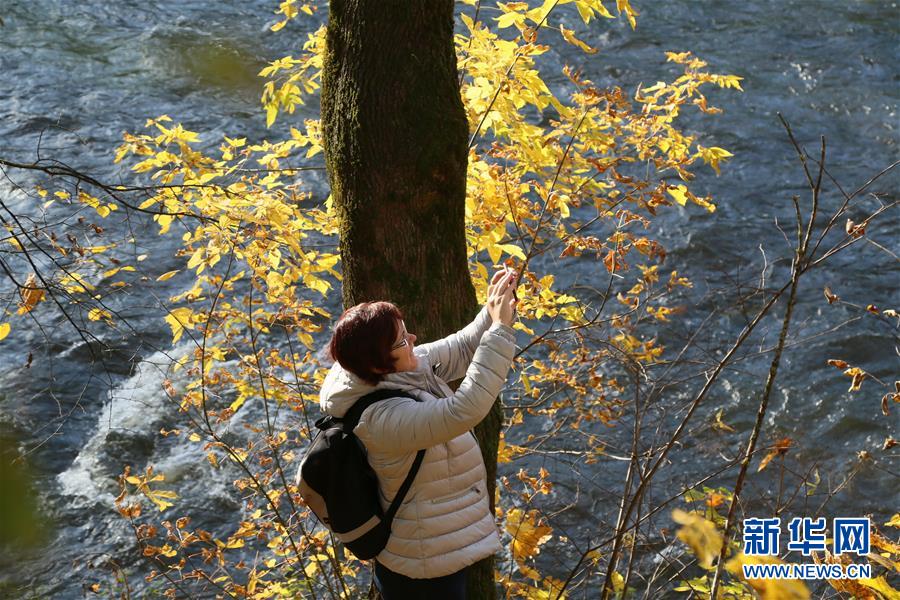 10月15日,在立陶宛首都维尔纽斯,一名女子拍摄秋景。新华社记者 郭明芳 摄