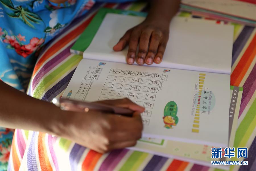 9月25日,在美国芝加哥,卡亚·恩朱比练习写汉字。 新华社记者 汪平 摄