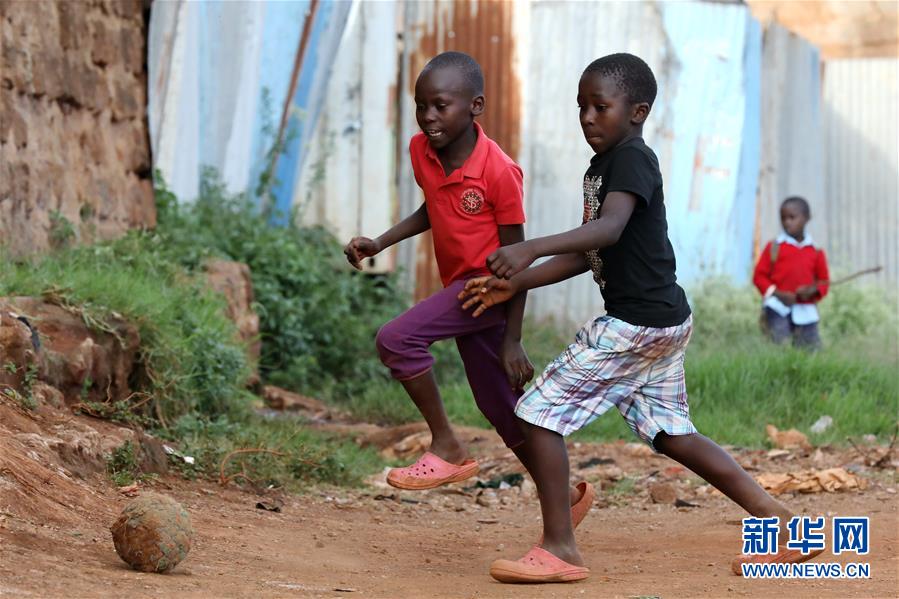 10月16日,在肯尼亚内罗毕基贝拉贫民窟,两名儿童在路边踢足球。 基贝拉贫民窟位于肯尼亚首都内罗毕西南,是内罗毕市内最大的贫民窟。基贝拉失业率超过50%,大多数居民每天收入不足1美元,一天只能吃上一顿饭。 10月17日是国际消除贫困日,联合国将今年的主题确定为“共同行动,实现儿童家庭社区赋权,消除贫困”。 新华社记者 王腾 摄