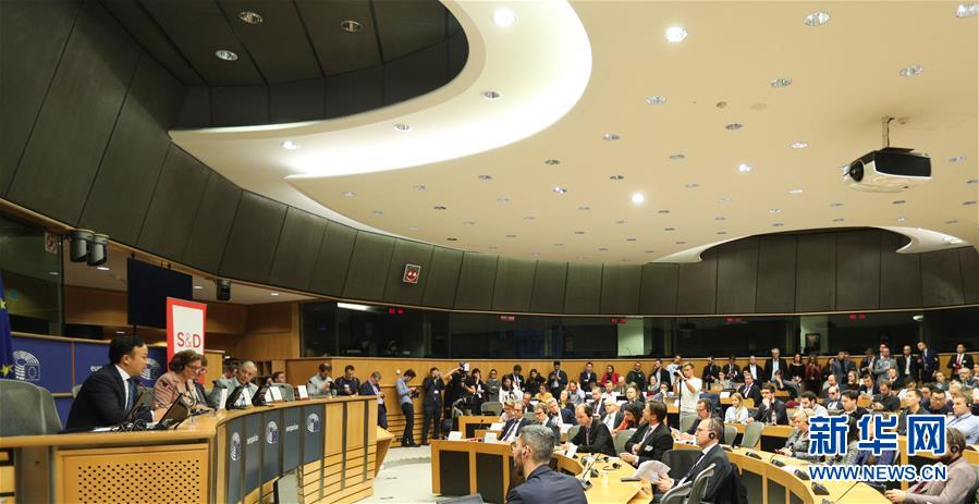 10月16日,华为公司驻欧盟机构首席代表刘康(左一)在比利时布鲁塞尔的欧洲议会参加公开辩论。新华社记者郑焕松摄