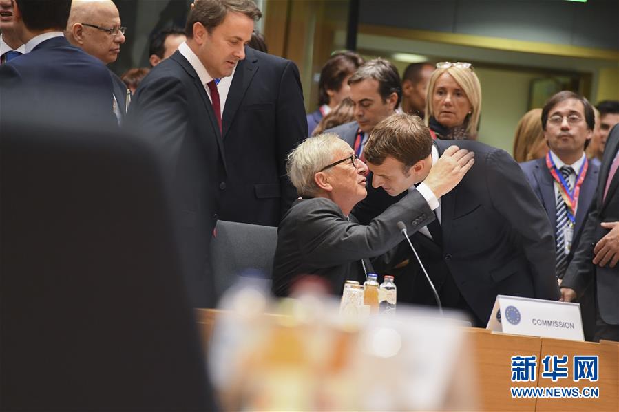 10月18日,在比利时布鲁塞尔,欧盟委员会主席容克(中)与法国总统马克龙(中右)在欧盟秋季峰会第二日会议上交谈。 欧盟峰会于17日至18日在比利时布鲁塞尔召开。 新华社发(里卡多·帕雷贾尼摄)
