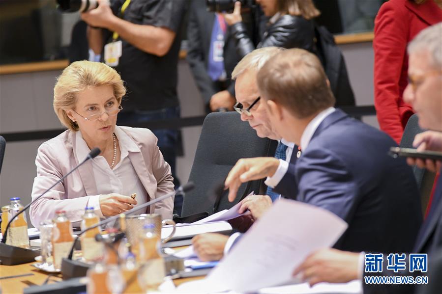 10月18日,在比利时布鲁塞尔,下届欧盟委员会主席冯德莱恩(左)与欧洲理事会主席图斯克(左三)在欧盟秋季峰会第二日会议上交谈。 欧盟峰会于17日至18日在比利时布鲁塞尔召开。 新华社发(里卡多·帕雷贾尼摄)