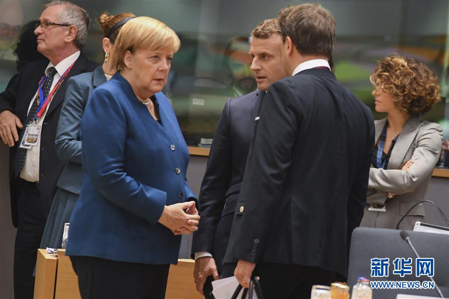 10月18日,在比利时布鲁塞尔,德国总理默克尔(前左)、法国总统马克龙(前中)与卢森堡首相贝泰尔(前右)在欧盟秋季峰会第二日会议上交谈。 欧盟峰会于17日至18日在比利时布鲁塞尔召开。 新华社发(里卡多·帕雷贾尼摄)