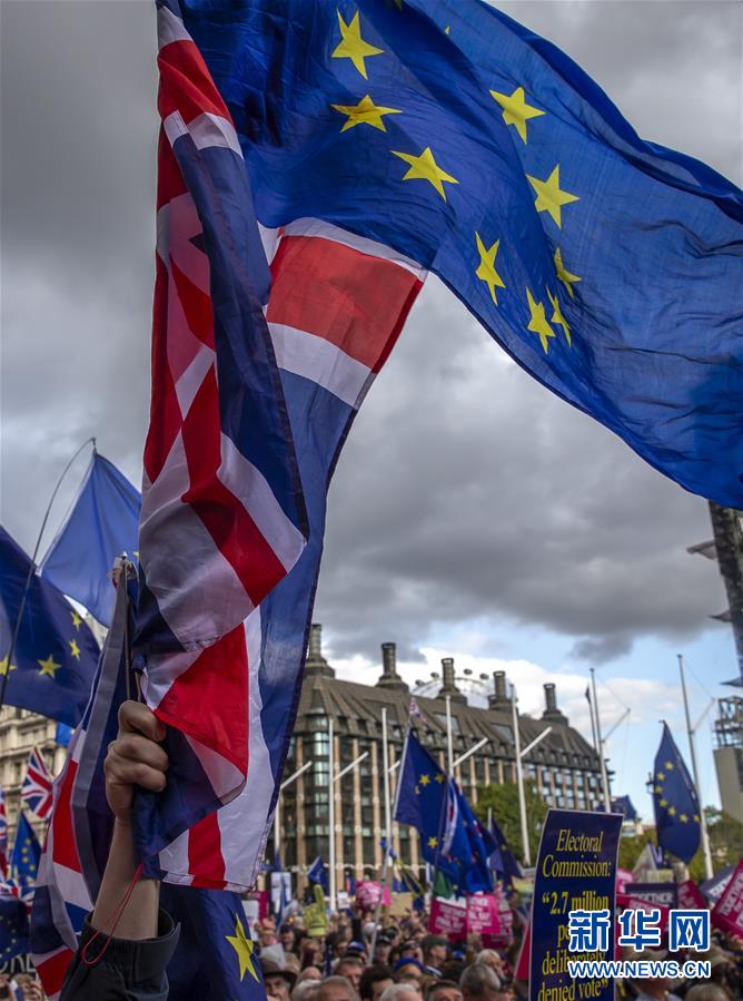 10月19日,人们在英国伦敦参加游行,呼吁英国举行第二次“脱欧”公投。 当日,数万名抗议者在英国议会大厦外游行示威,挥舞欧盟旗帜,呼吁举行第二次“脱欧”全民公投。英国议会下院19日投票通过一项关键修正案,实质上将迫使首相鲍里斯·约翰逊致信欧盟、寻求再度推迟“脱欧”。 新华社记者 韩岩 摄