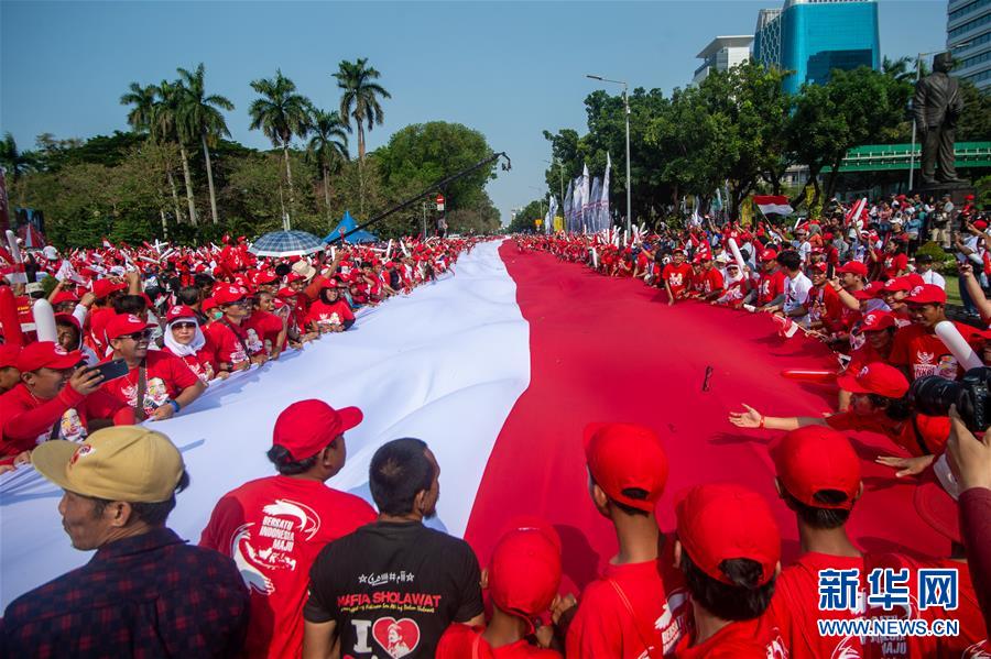 10月20日,在印度尼西亚雅加达,人们在街头展开一面巨型印尼国旗。 当日,印度尼西亚总统佐科就职仪式在位于雅加达的国会大厦举行。 新华社发(维里摄)