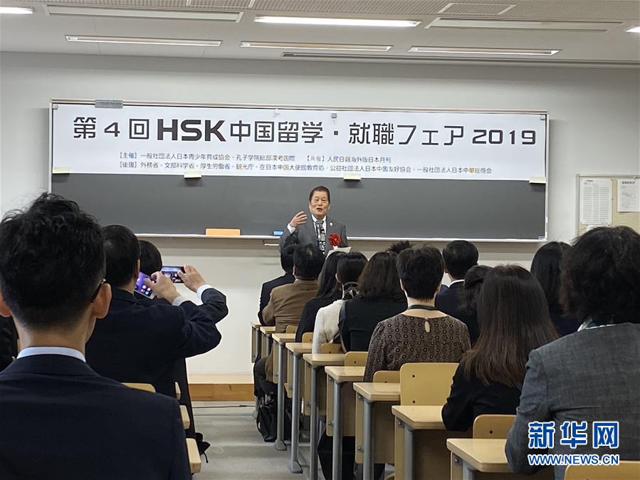 10月19日,在日本东京,日本青少年育成协会会长增泽空在日本第四届汉语水平考试(HSK)中国留学·求职会开幕式上致辞(手机拍摄)。 新华社记者 郭丹 摄
