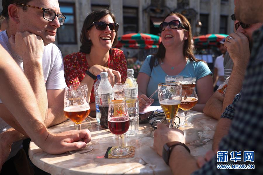 这是2018年9月9日在比利时布鲁塞尔大广场拍摄的啤酒爱好者品尝啤酒。 新华社记者 郑焕松 摄