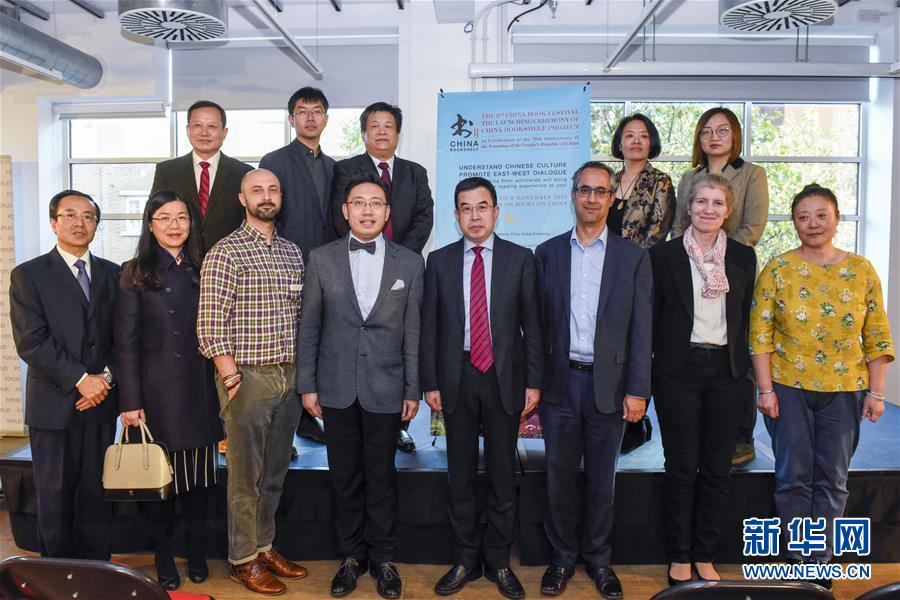 10月22日,在英国伦敦,来宾在“中国书架”的启动仪式上合影。 中国优秀图书海外推广项目“中国书架”在英国的启动仪式22日在英国伦敦福伊尔书店旗舰店举行,来自中英出版发行界和学术、教育、传媒界的数十位来宾出席仪式。 新华社发(史蒂芬·程摄)
