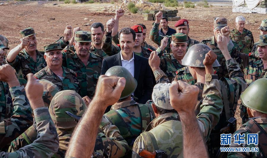 10月22日,在叙利亚伊德利卜省哈比特镇,叙利亚总统巴沙尔·阿萨德(中)接见政府军人员。 据叙利亚通讯社22日报道,叙总统巴沙尔·阿萨德当天前往叙西北部伊德利卜省前线,在该省哈比特镇接见政府军人员。 新华社发(叙利亚总统府供图)