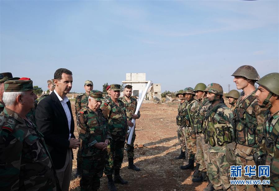 10月22日,在叙利亚伊德利卜省哈比特镇,叙利亚总统巴沙尔·阿萨德(左二)接见政府军人员。 据叙利亚通讯社22日报道,叙总统巴沙尔·阿萨德当天前往叙西北部伊德利卜省前线,在该省哈比特镇接见政府军人员。 新华社发(叙利亚总统府供图)