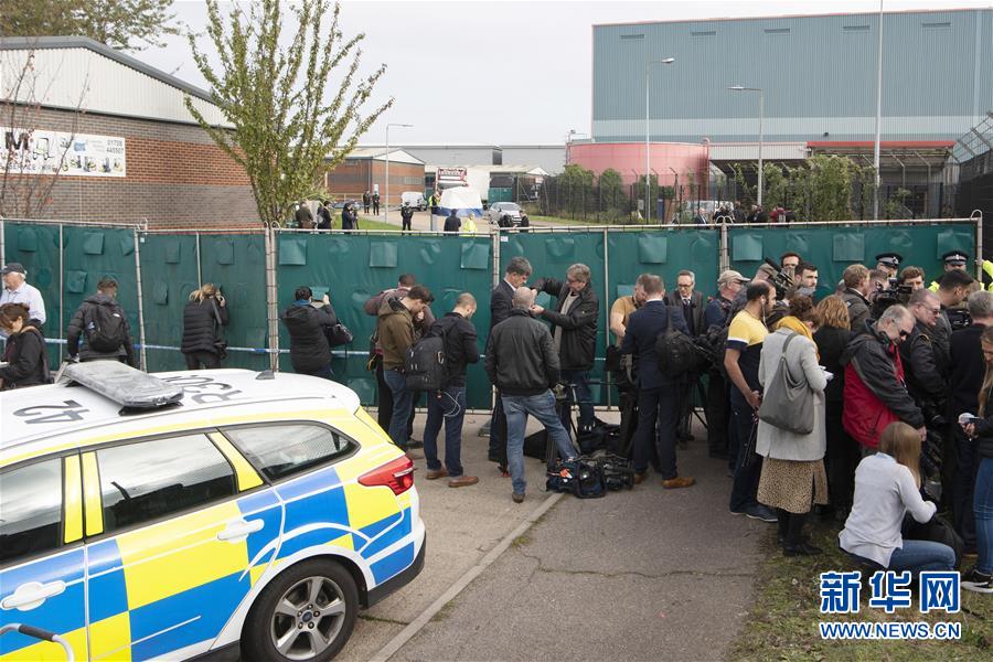 10月23日,在英国埃塞克斯郡,大量媒体人员聚集在发现尸体的工业园区附近。 英国警方23日说,在埃塞克斯郡一个工业园区内的一辆集装箱货车里发现39具尸体。 新华社发(雷伊·唐摄)