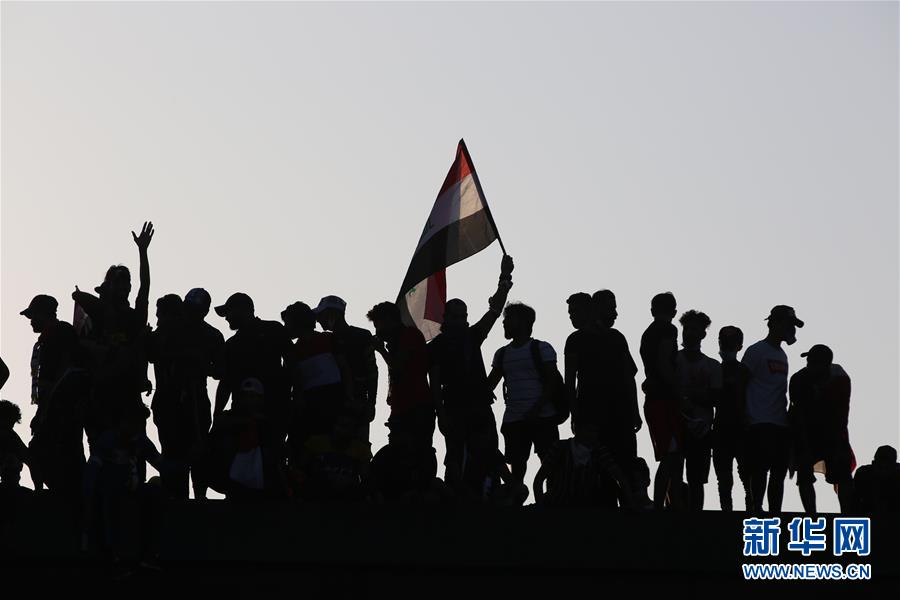 10月26日,在伊拉克巴格达,示威者在解放广场附近建筑楼顶挥舞国旗。 新华社发(哈利勒·达伍德摄)