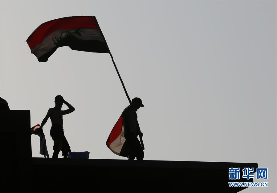 10月26日,在伊拉克巴格达,示威者在解放广场附近建筑楼顶参加抗议活动。 新华社发(哈利勒·达伍德摄)