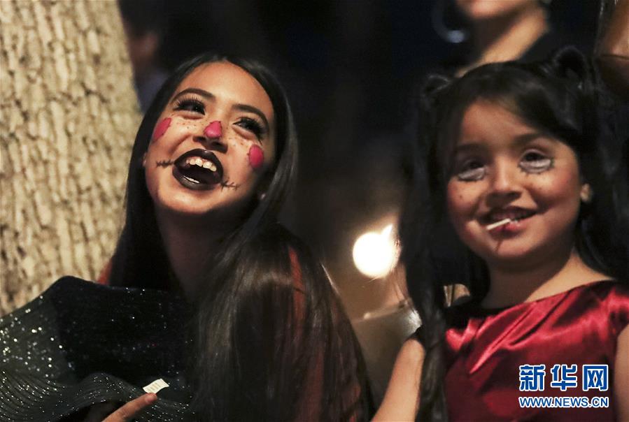 10月26日,在美国加利福尼亚州阿纳海姆,两名女孩观看万圣节游行。 当日,阿纳海姆举行万圣节游行活动,迎接即将到来的节日。 新华社记者 李颖 摄
