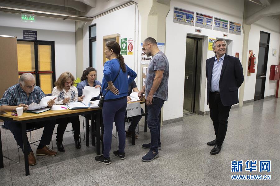 10月27日,阿尔韦托·费尔南德斯(右一)在阿根廷布宜诺斯艾利斯的投票点投票。 据阿根廷国家选举委员会27日晚公布的统计数据,中左翼反对派总统候选人阿尔韦托·费尔南德斯在当日举行的大选投票中得票率超过45%,当选下一任总统。 新华社发(马丁·萨巴拉摄)