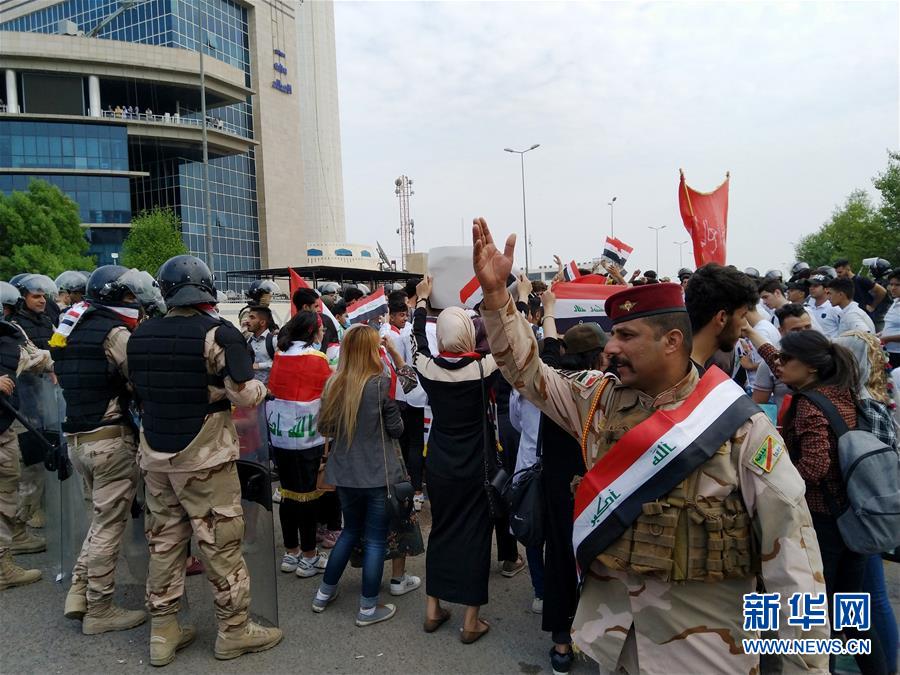 10月28日,在伊拉克首都巴格达,示威者参加抗议活动。 负责维护伊拉克首都巴格达安全的巴格达行动指挥部28日宣布,鉴于伊拉克多地大规模示威抗议活动仍在持续,从当晚开始在巴格达实施宵禁。 新华社发(哈利勒·达伍德 摄)