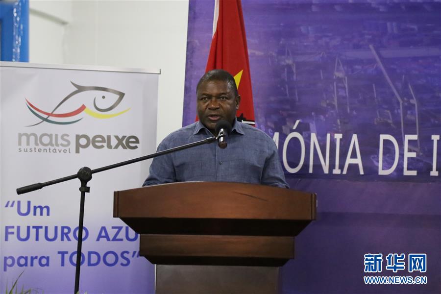 10月28日,莫桑比克总统纽西在中企承建的莫桑比克贝拉渔码头项目交付仪式上讲话。新华社记者 聂祖国 摄