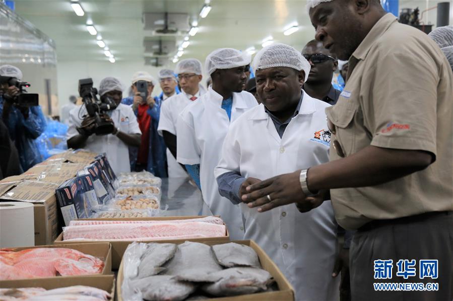 10月28日,莫桑比克总统纽西(右二)在中企承建的莫桑比克贝拉渔码头项目交付仪式上参观冷库。新华社记者 聂祖国 摄