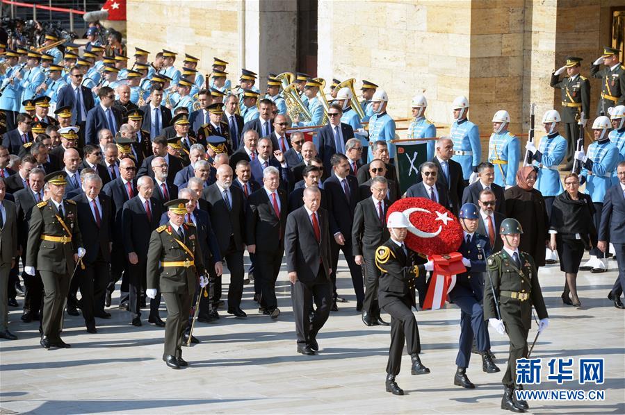 10月29日,在土耳其首都安卡拉,土耳其总统埃尔多安(中)出席国庆庆典。 当日,土耳其在首都安卡拉国父陵举行仪式,庆祝土耳其共和国成立96周年。 新华社发(穆斯塔法·卡亚 摄)