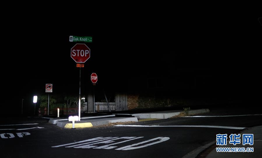 10月28日,在美国加利福尼亚州旧金山湾区的雷德伍德城,山区的一处居民区停电。 为防范强风刮断电线引燃山林,加州主要的电力企业太平洋天然气和电气公司26日下午开始在加州北部实行预防性断电措施,涉及36个县约94万用户用电。 新华社记者吴晓凌摄