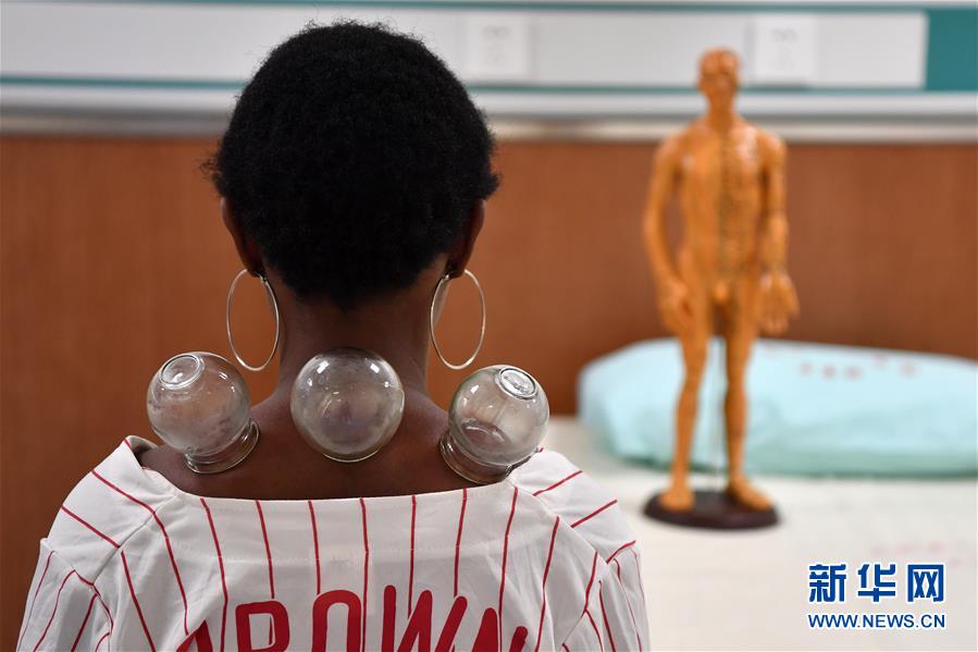拉一莎在河南省人民医院体验拔火罐(10月27日摄)。新华社记者 李嘉南 摄