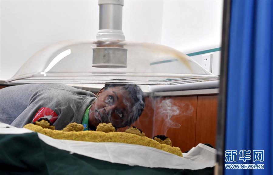 拉一莎在河南省人民医院观看艾灸治疗(10月27日摄)。新华社记者 李嘉南 摄