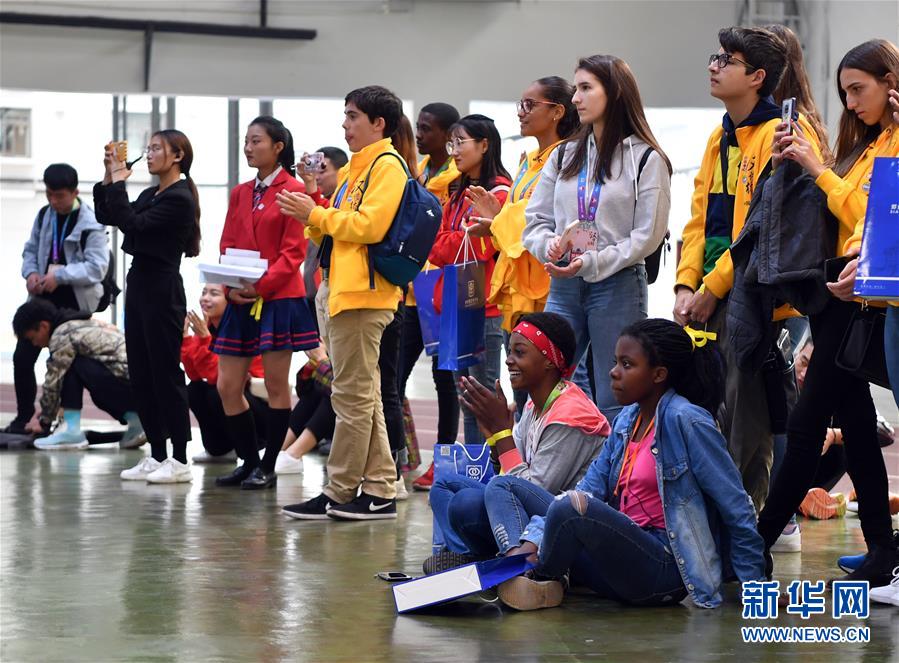 拉一莎(下左)在郑州西亚斯学院观看舞狮表演(10月28日摄)。新华社记者 李嘉南 摄