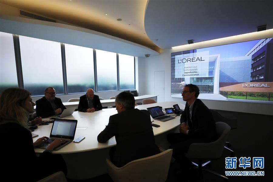 10月24日,在法国巴黎地区克里希市的欧莱雅集团总部,员工在会议室开会。新华社记者 高静 摄