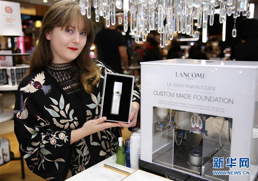10月25日,在法国巴黎,一名顾客展示欧莱雅集团的美妆黑科技产品:兰蔻定制粉底液,该产品将连续两次在进博会上展出。新华社记者 高静 摄